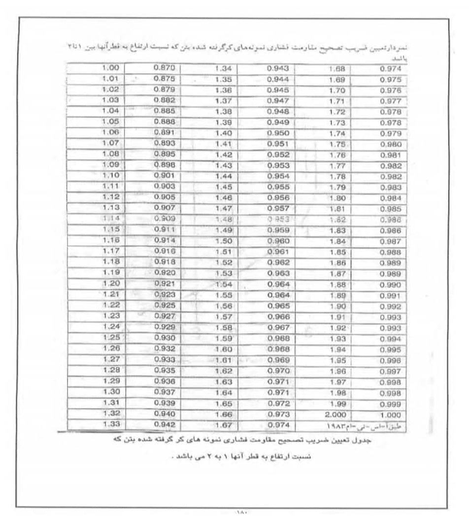 جدول- تعیین ضریب تصحیح مقاومت فشاری نمونه های کر گرفته شده بتن که نسبت ارتفاع به قطر 1 به 2 می باشد