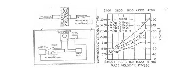 آزمایش های استاندارد مقاومت بتن دارای محدودیت هایی از قبیل نحوه تهیه، ساخت و عمل آوری و زمان آزمایش و همچنین در حد تراكم بتن در سازه و غیره می باشد و نمونه های تهیه شده در این روش معرف واقعی بتن در سازه نبوده و امكان بررسی دقیق خواص واقعی بتن در سازه از این طریق امكان پذیر نیست. با توجه به اینكه روش های تهیه خساراتی به سازه وارد ساخته و هزینه زیادی را متحمل می شود تلاش های زیادی صورت گرفته كه بتوان به صورتی بدون تخریب، خواص فیزیكی بتن كه به مقاومت ارتباط دارد اندازه گیری نمود. مطالعاتی كه تاكنون به عمل آمده هیچگونه رابطه واحدی بین سرعت و مقاومت بتن بدست نداده، ضمن اینكه تحت شرایط مشخصی این دو كمیت توسط عامل مشترك وزن مخصوص بتن به هم مربوط می شوند. نتایج نشان می دهد كه هرگونه تغییر در وزن مخصوص منجر به تغییر در سرعت پالس در بتن می شود. كاهش در اثر وزن مخصوص و افزایش نسبت آب به سیمان كه مقاومت فشاری بتن و هم سرعت پالس را كاهش می دهد. سرعت های بسیار بالا بیانگر یك بتن بسیار خوب و سرعت های بسیار كم بیانگر یك بتن ضعیف می باشد. این دستگاه به صورت شماتیك در شكل زیر آمده است.