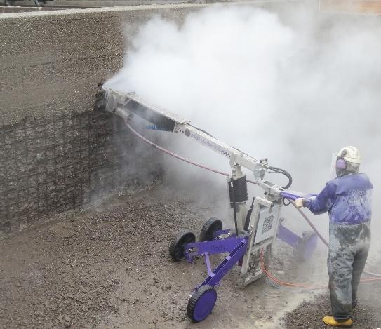 شکل زیریکی دیگر از روشهای تمیزکاری و آمادهسازی سطح بتن را نشان میدهد. همانطور که نشان دادهشده است، تمیز کردن سطح با استفاده از یخ خشک نیز میتواند انجام شود. مزیت استفاده از یخ خشک عدم ورود اجباری آب به بتن است. البته به دلیل آزاد شدن گاز دیاکسید کربن، استفاده از تجهیزات ایمنی فردی و تهویه کامل (تنها در محیط داخلی) اجباری است. صرفنظر از نوع تمیزکاری اجراشده، سطح تنها باید تمیز شده و هیچ مادهای از سطح جدا نشود.